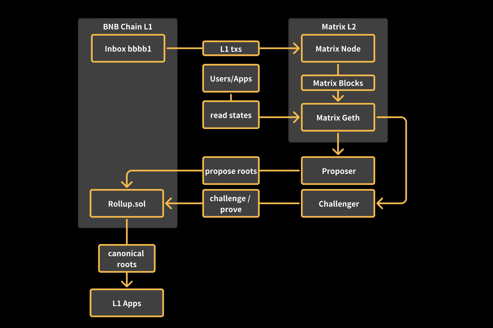 Matrix is a next-generation calldata-scaled rollup architecture built for high-throughput applications, enabling ultra-low gas, predictable fees, and secure execution backed by BNB Chain L1.